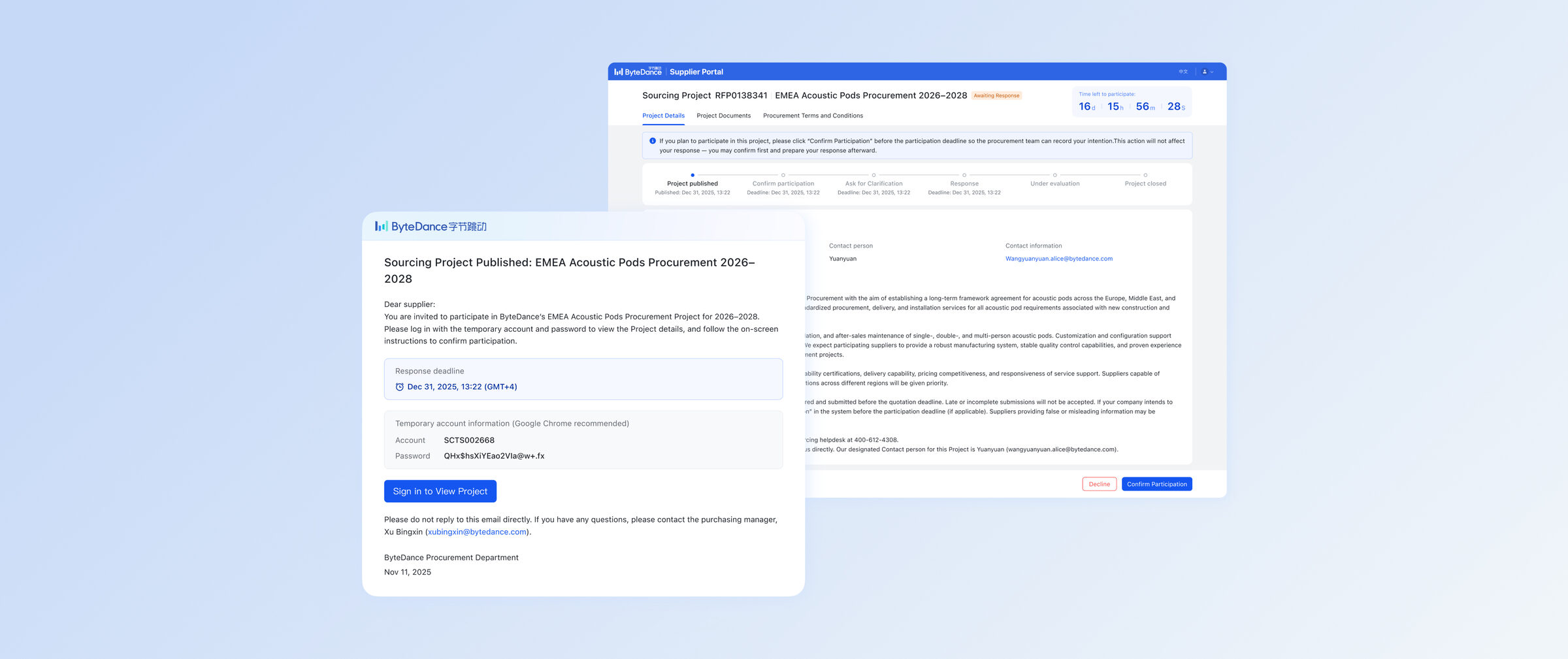 I redesigned a key slice of ByteDance's Supplier Portal sourcing experience, from invitation → participation confirmation → progress tracking, so suppliers, buyers, and legal teams had the context they needed to move forward. This increased online sourcing adoption and reduced reliance on email.
